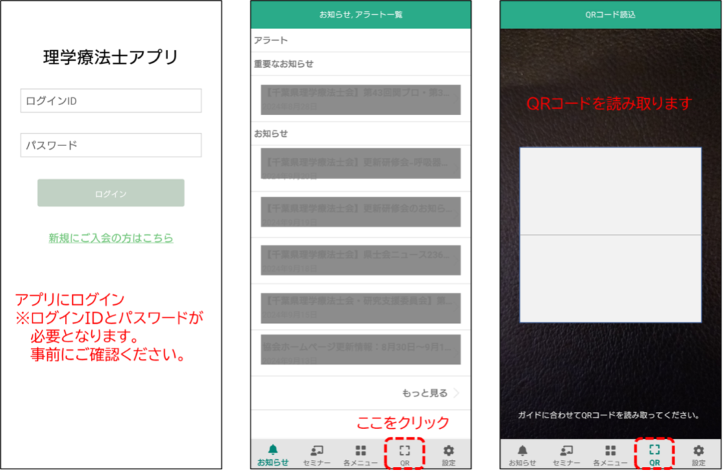 以下の方法で受付のQRコードを読み取ってください(下図を参照)。