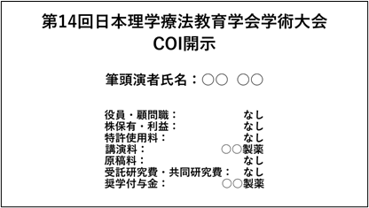 - ポスター発表も利益相反について開示してください。開示する内容は、スライド例をご参照のうえ、同等の内容をポスター中に文書にて掲載してください。