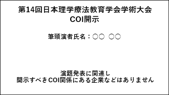 - 筆頭演者は利益相反の有無に係わらず、発表スライドの最初にCOIの有無を明示し、その内容を開示しなければなりません。スライド見本等は下記をご確認の上、利益相反状態の開示を行ってください。